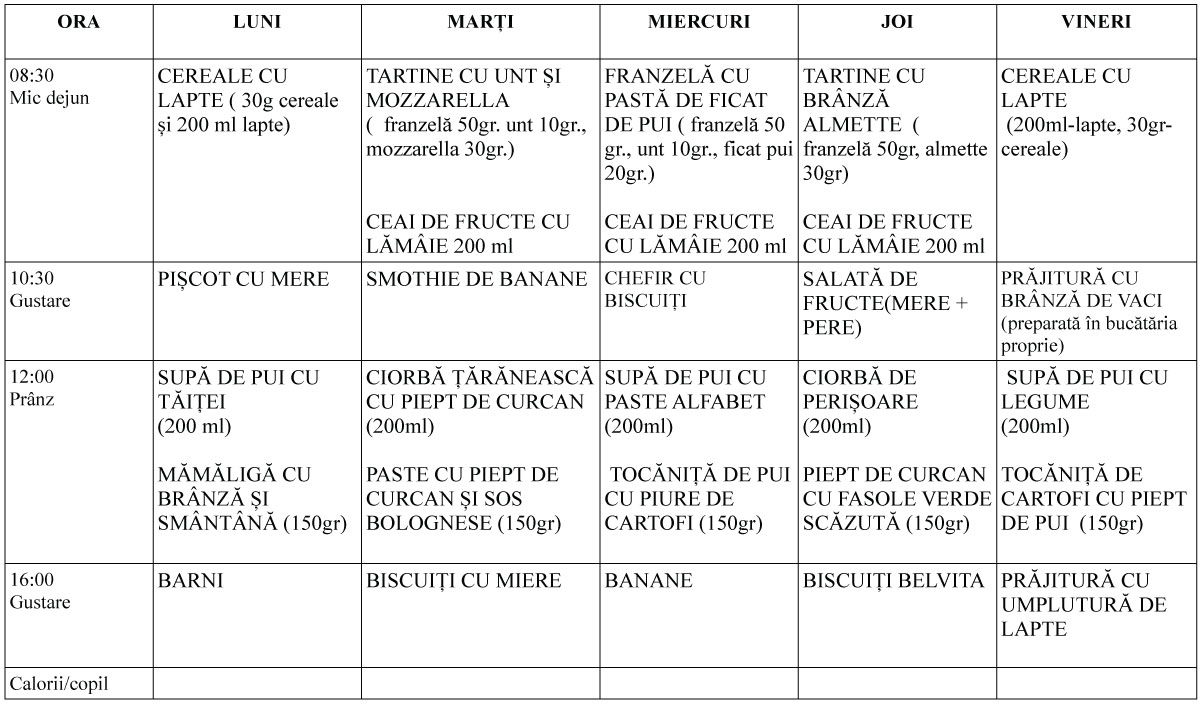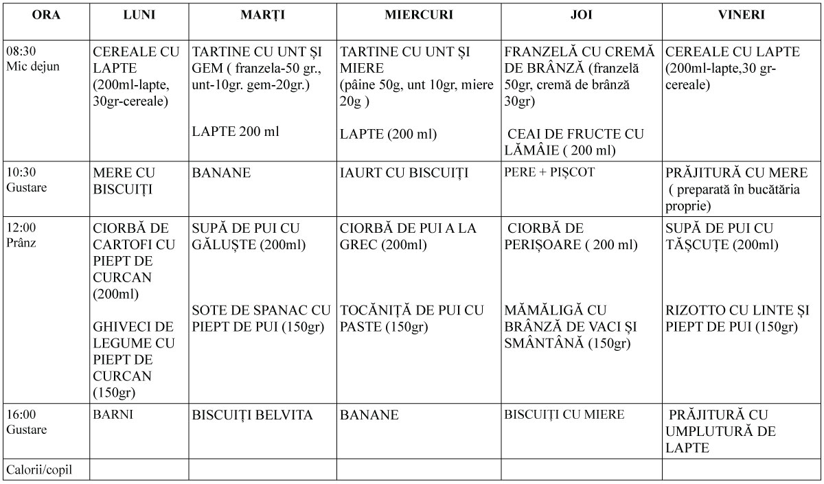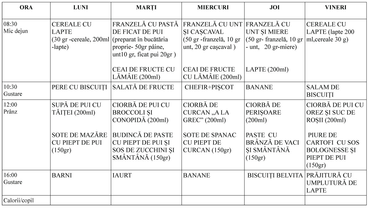 În cadrul creșelor se asigură o alimentație adaptată vârstei și stării de sănătate a copiilor, asigurându-se zilnic un raport caloric și nutritiv în conformitate cu recomandările și reglementările Ministerului Sănătății. Pentru aprecierea cantităților de alimente consumate pe zi de un copil, dar și a raportului calitativ pentru nutrienți, se efectuează de câteva ori pe an anchete alimentare de către personalul medical competent în acest domeniu. Alimentele consumate de copii sunt proaspete, acestea se pregătesc zilnic în bucătăriile proprii, dotate la standarde europene, de către personal calificat.